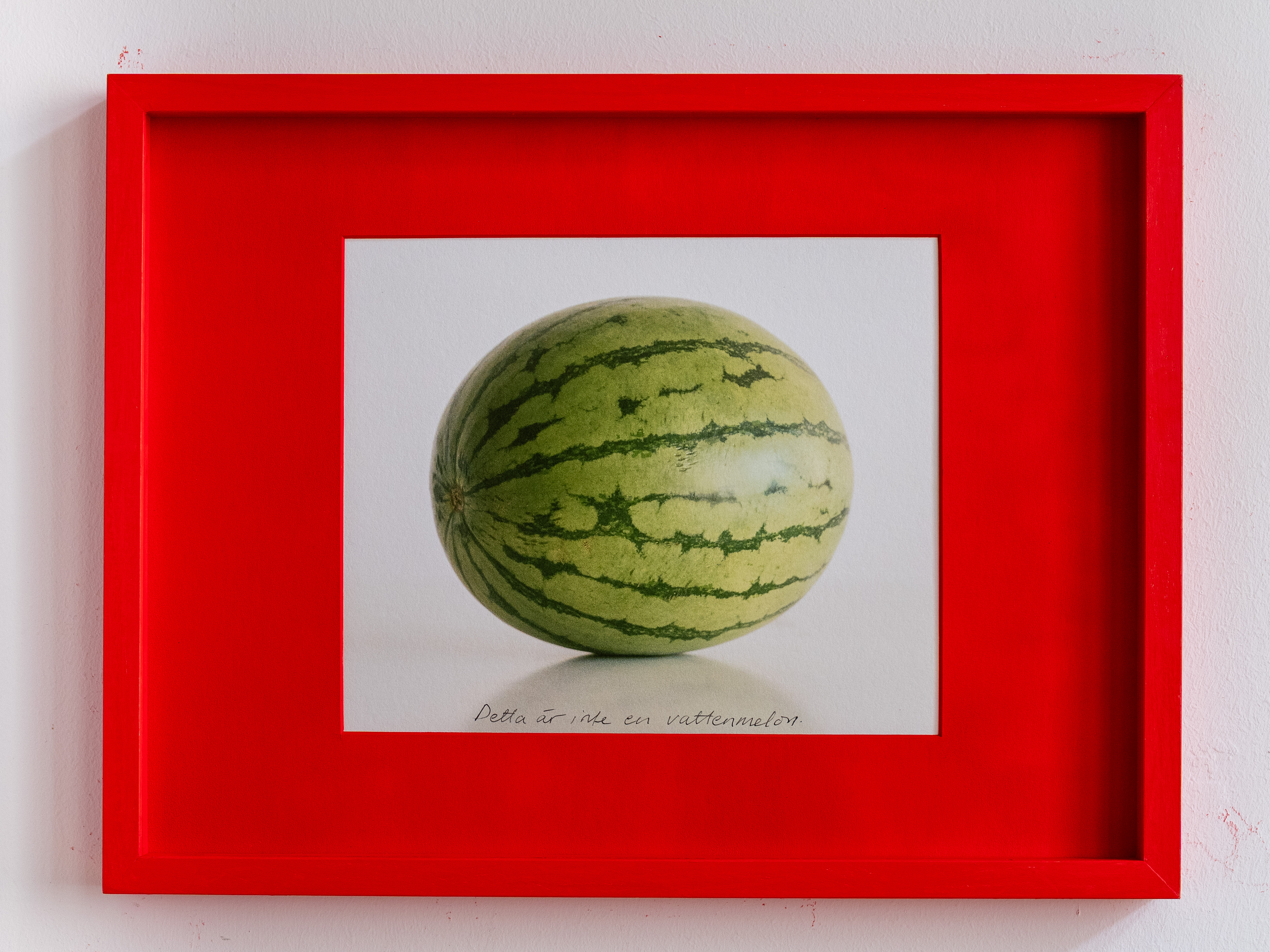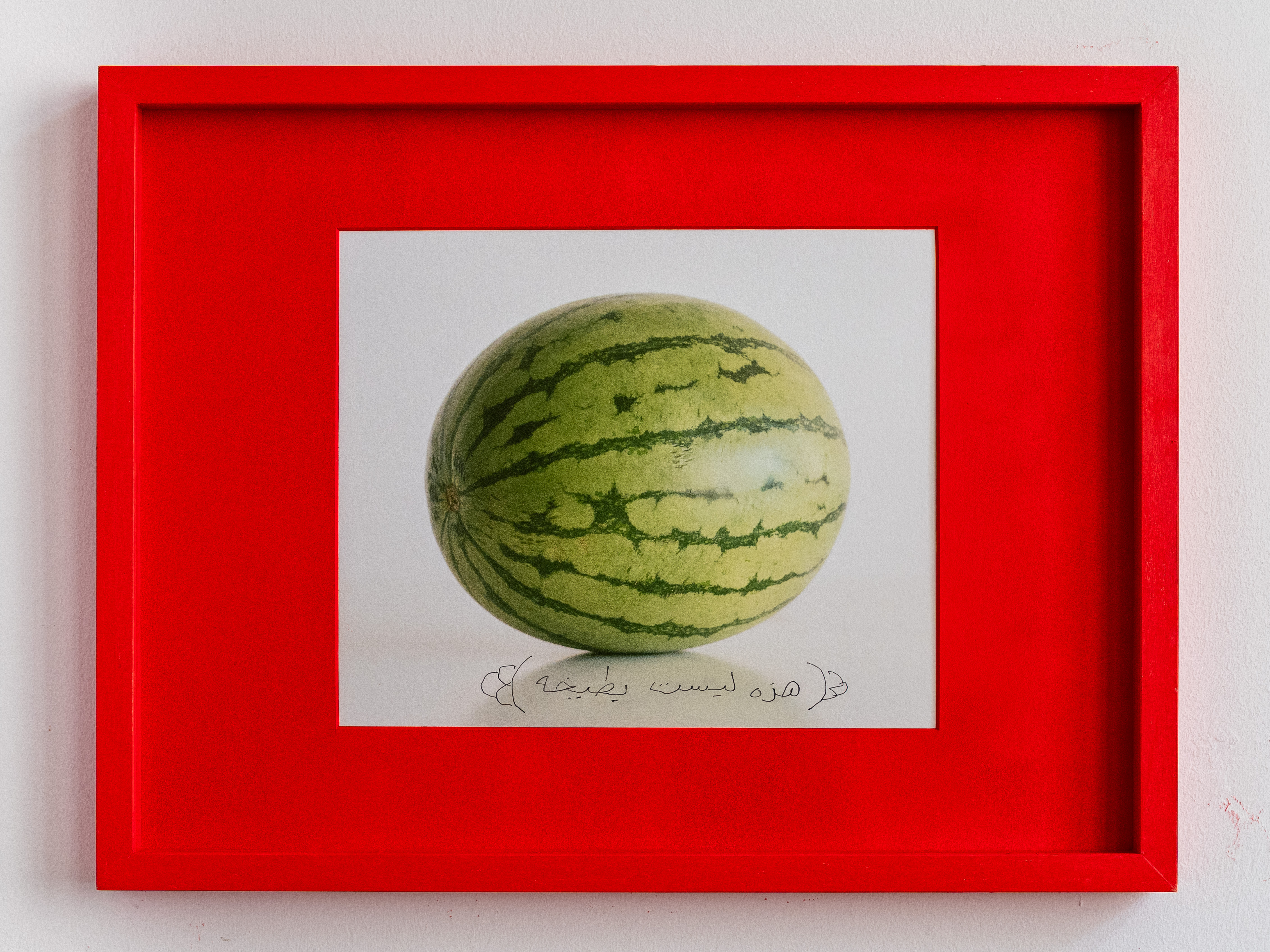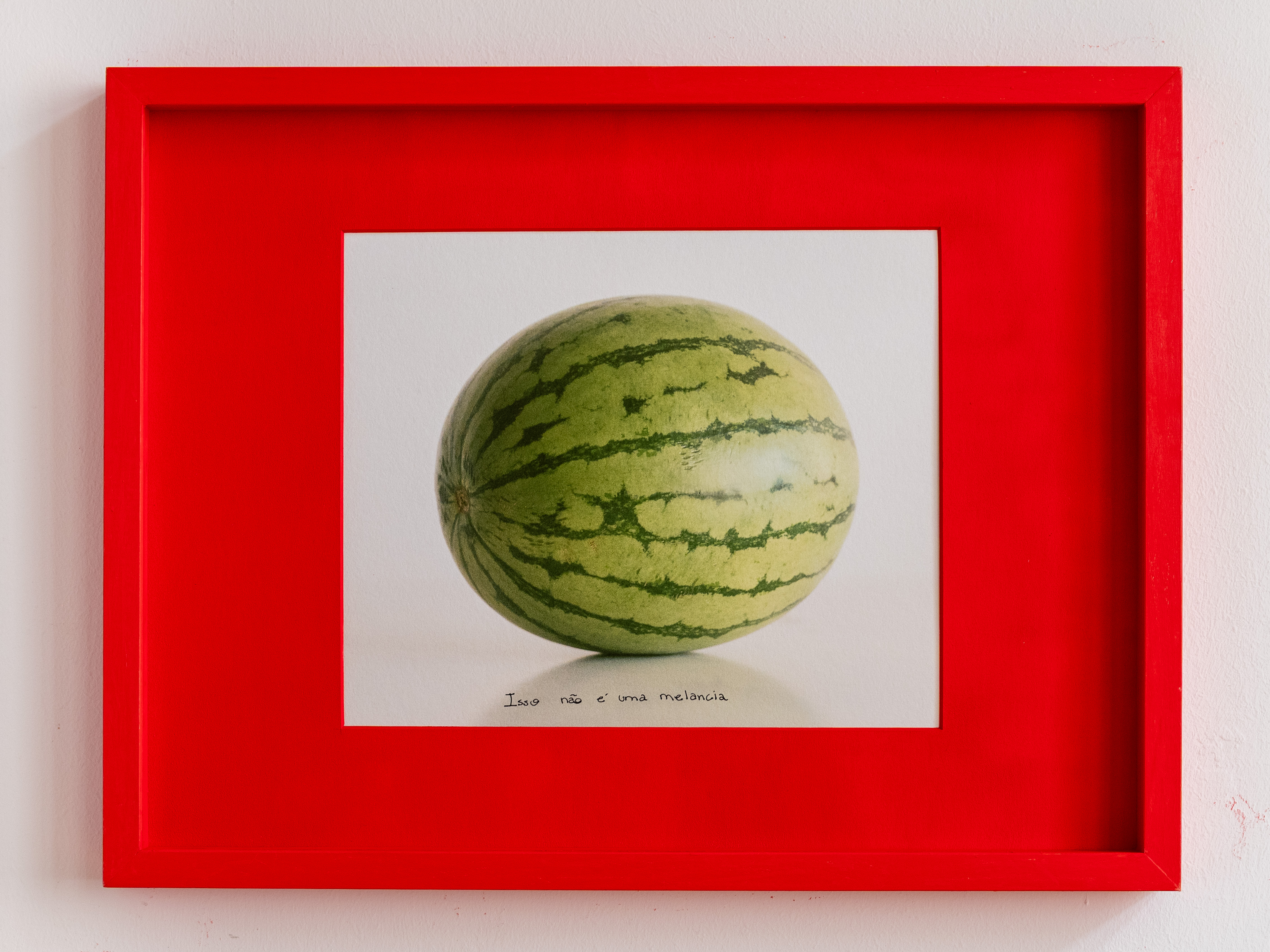 An analog photograph of a watermelon, displayed in a red frame, has been reproduced multiple times and framed accordingly. Yet, each version is unique: on every print, the handwritten phrase “This is not a watermelon” appears in a different language.
