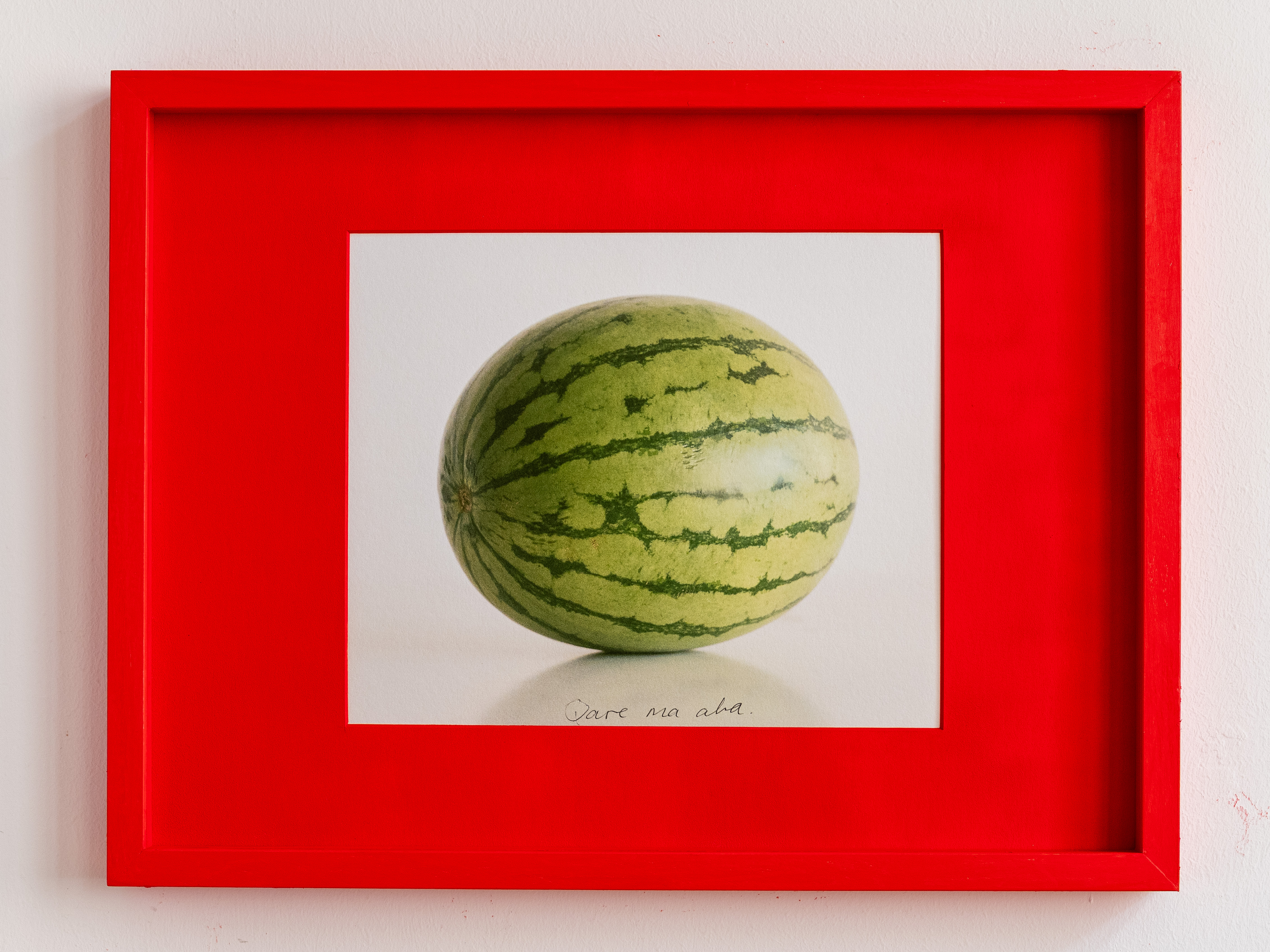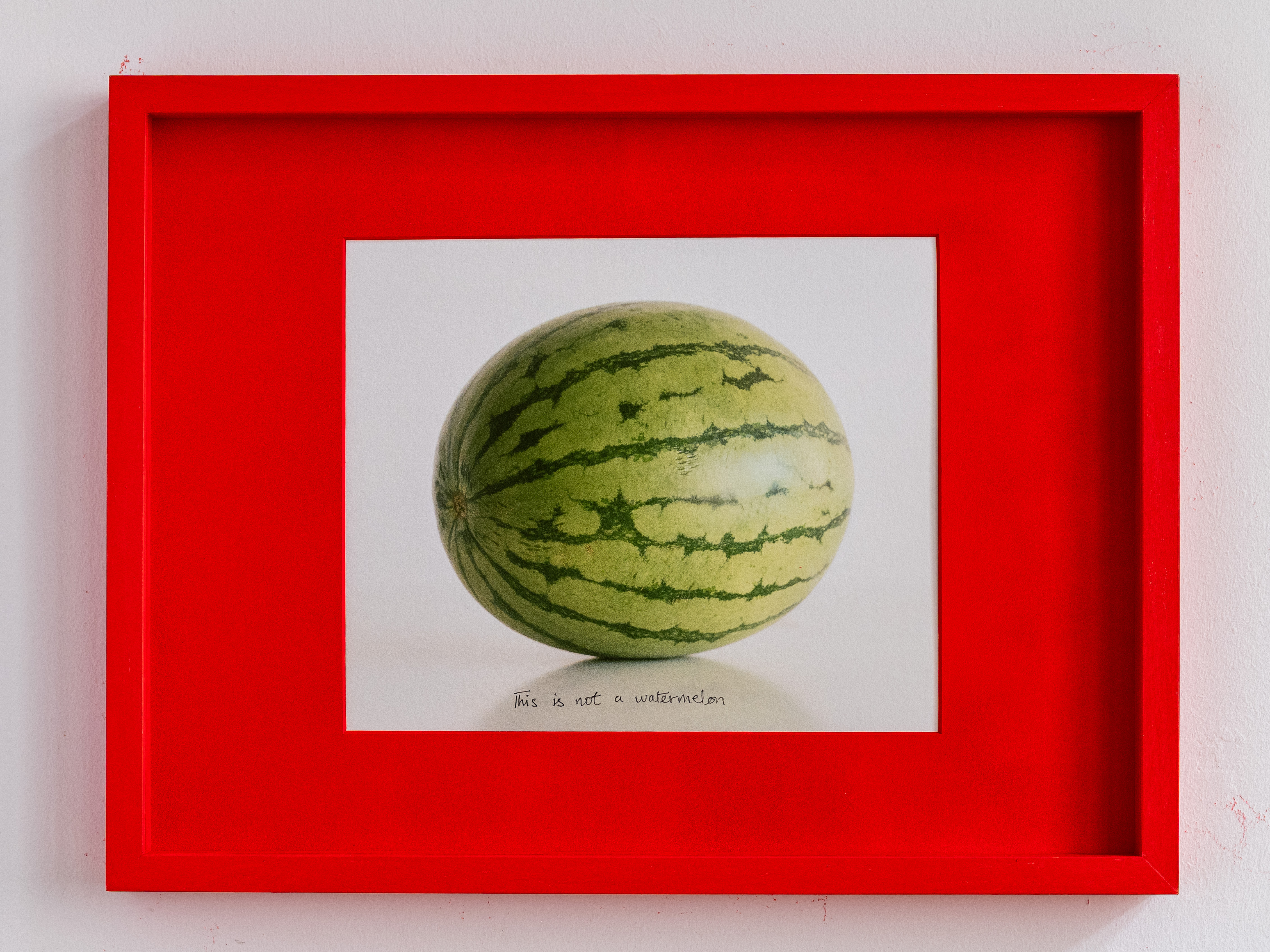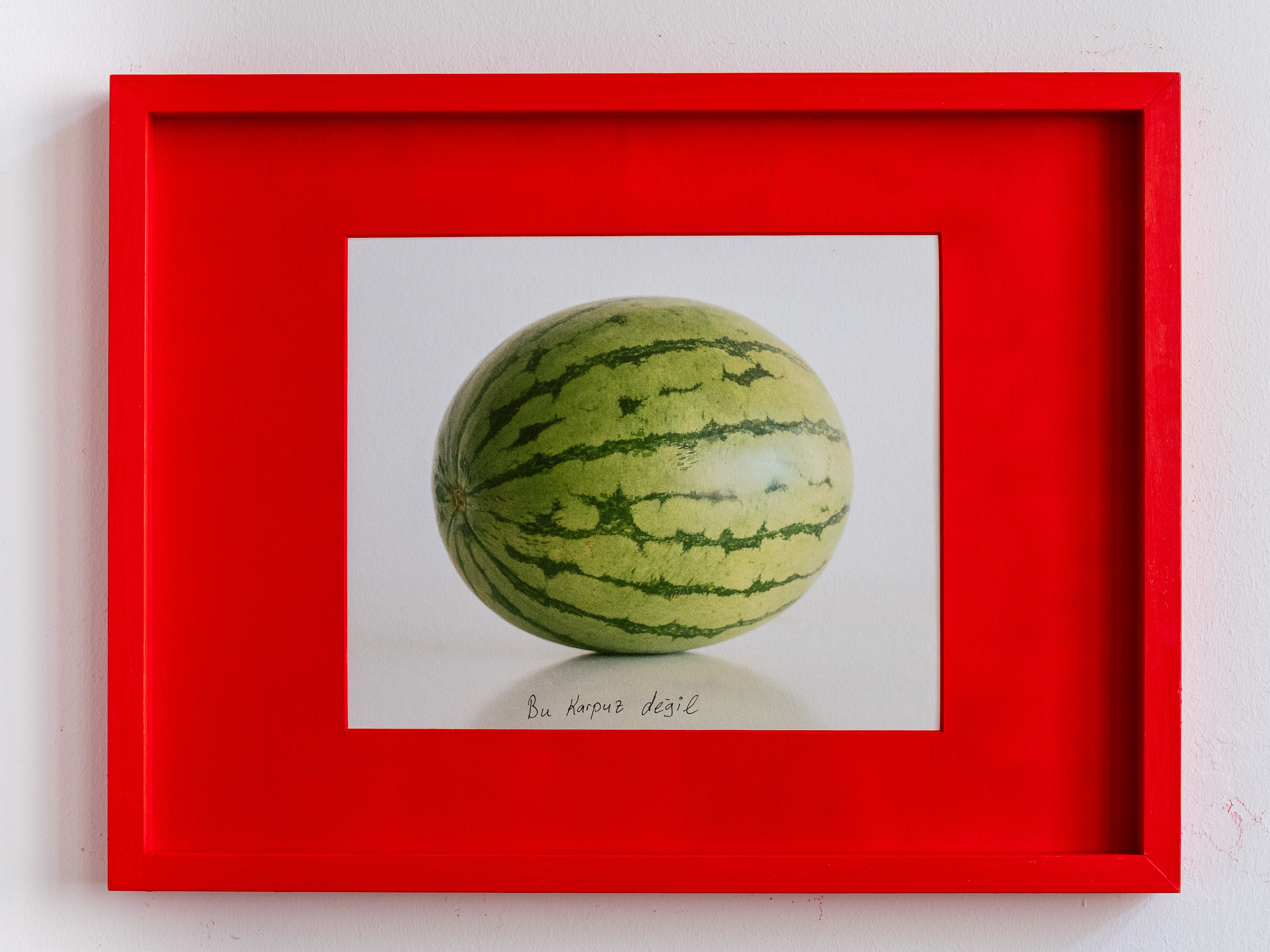 An analog photograph of a watermelon, displayed in a red frame, has been reproduced multiple times and framed accordingly. Yet, each version is unique: on every print, the handwritten phrase “This is not a watermelon” appears in a different language.
